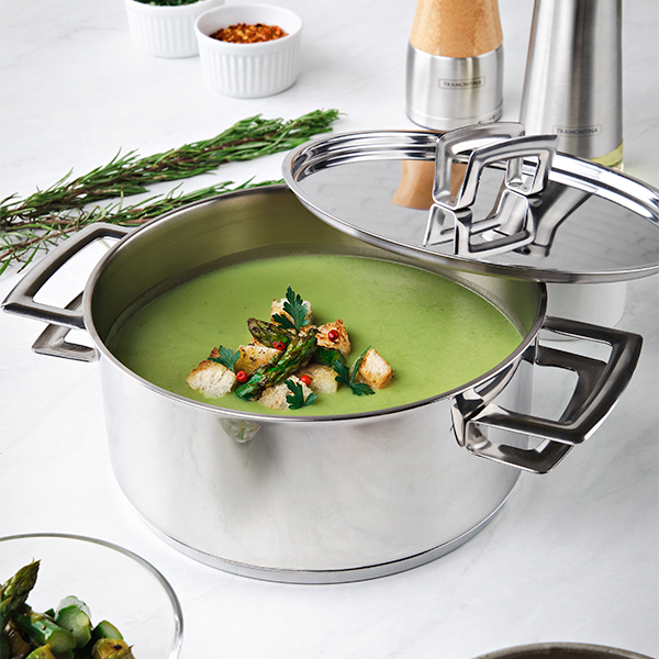 Tempere com sal e pimenta a gosto. Sirva a sopa creme de aspargos quente, acompanhada de croutons crocantes, se desejar.